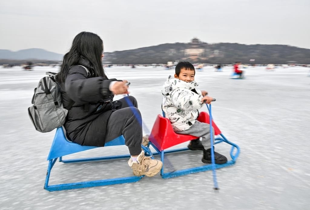 1月1日,游客在頤和園冰場(chǎng)玩冰車(chē)。新華社記者 陳曄華 攝
