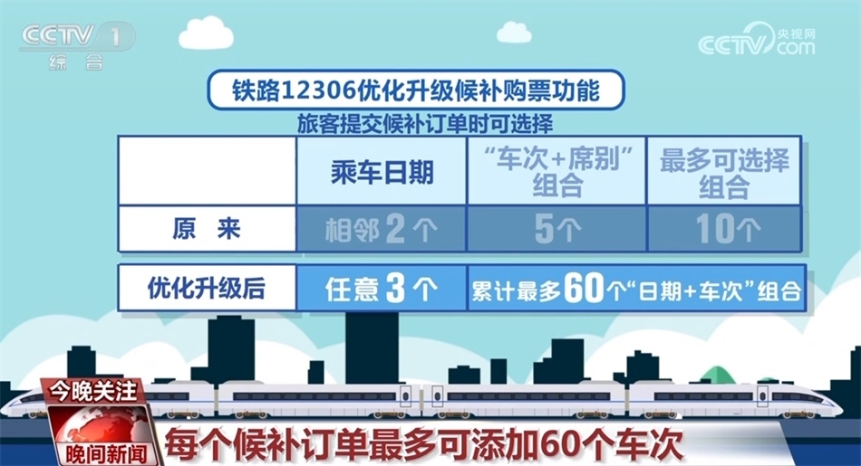 自1月11日零時(shí)起,鐵路12306優(yōu)化升級(jí)候補(bǔ)購票功能,來看一下具體變化:優(yōu)化升級(jí)后,每名旅客可提交的待兌現(xiàn)候補(bǔ)訂單數(shù)量由2個(gè)增至6個(gè),每個(gè)訂單最多可添加9名乘車人;原來旅客提交候補(bǔ)訂單時(shí),可選擇相鄰2個(gè)乘車日期、每個(gè)日期可選擇5個(gè)“車次+席別”的組合,最多可選擇10個(gè)組合。優(yōu)化升級(jí)后,旅客可選擇預(yù)售期內(nèi)任意3個(gè)乘車日期,累計(jì)最多可選擇60個(gè)“日期+車次”的組合;原來候補(bǔ)訂單截止兌現(xiàn)時(shí)間最晚為開車前2小時(shí),優(yōu)化升級(jí)后調(diào)整為開車前20分鐘。