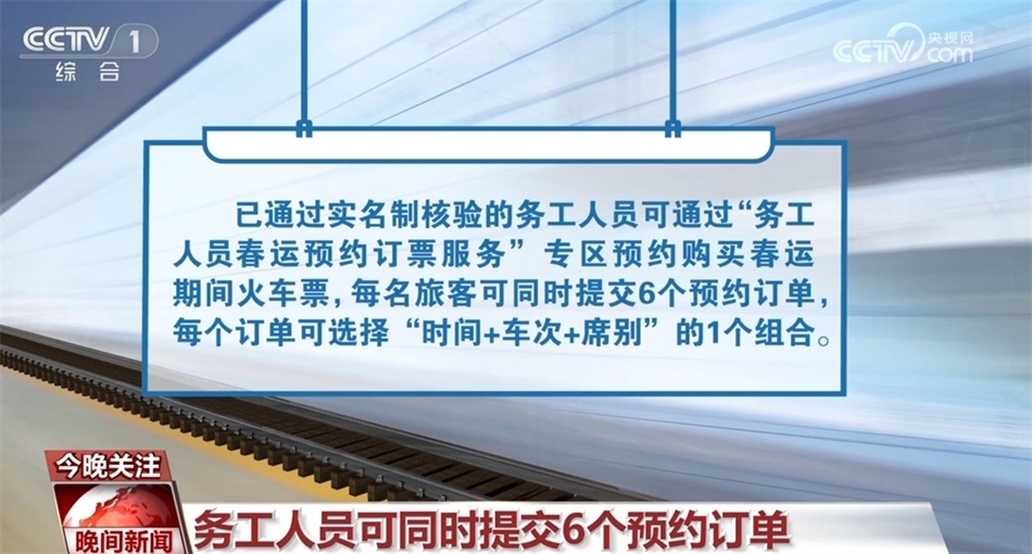 已通過實(shí)名制核驗(yàn)的務(wù)工人員可通過“務(wù)工人員春運(yùn)預(yù)約訂票服務(wù)”專區(qū)預(yù)約購買春運(yùn)期間火車票,每名旅客可同時(shí)提交6個(gè)預(yù)約訂單,每個(gè)訂單可選擇“時(shí)間+車次+席別”的1個(gè)組合。