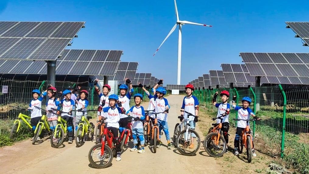 圖為研學團的小朋友們騎行參觀小王莊鎮(zhèn)光伏電站。新華社發(fā)(李暢攝)