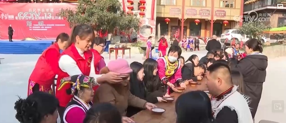 在四川綿陽市北川縣石椅村,一大早,村民和志愿者就忙著熬制臘八粥。石椅村熬制的臘八粥是咸味的,食材除了糯米、花生、白蘿卜、胡蘿卜,還有當?shù)氐奶禺a臘肉和豆干。經過一個多小時的熬制,別具風味的臘八粥就起鍋了。村民們擺上長桌宴,把熱騰騰、香噴噴的臘八粥端到游客面前,一起感受年味兒。
