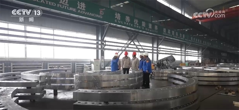 總臺(tái)央視記者 古峻嶺:這個(gè)大家伙叫輪轂,就是風(fēng)機(jī)葉輪中間這個(gè)位置,就是它把重達(dá)百?lài)嵉?支葉片牢牢固定在風(fēng)機(jī)之上。采用傳統(tǒng)人工的方式,需要2個(gè)人花上180分鐘才能安裝完,現(xiàn)在只需要80分鐘即可完成。傳統(tǒng)定點(diǎn)裝配模式一天只能裝配3—4臺(tái)主機(jī),而在現(xiàn)在的流水線(xiàn)上作業(yè),一天則可以裝配6—8臺(tái)主機(jī),效率翻倍,但是用工卻減少了一半。