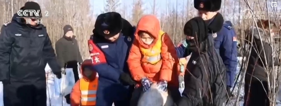 在馴鹿園里,“小荔枝”們近距離與馴鹿接觸,在皚皚白雪地里撒歡兒,坐在雪圈上玩得那叫一個歡實。