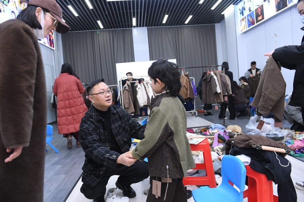 2024年1月17日,在位于浙江省湖州市織里鎮(zhèn)的萬順服飾股份有限公司,工作人員(前左二)在品牌的2024秋季新品審版會后臺和小模特交流。織里鎮(zhèn)是中國最大的童裝產(chǎn)業(yè)集群地,聚集著1.4萬家童裝企業(yè)。新華社記者 翁忻旸 攝