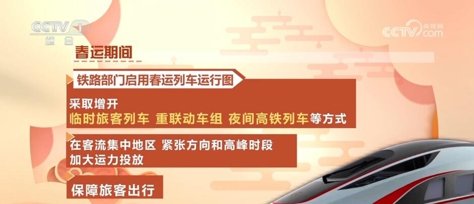 春運(yùn)期間,鐵路部門啟用春運(yùn)列車運(yùn)行圖,采取增開臨時旅客列車、重聯(lián)動車組、夜間高鐵列車等方式,在客流集中地區(qū)、緊張方向和高峰時段加大運(yùn)力投放,保障旅客出行。國鐵濟(jì)南局春運(yùn)期間安排臨客超90對,其中開行去往北京、上海、石家莊、哈爾濱、福州等方向跨省臨客47對。國鐵武漢局春運(yùn)首日加開臨客49對,哈爾濱鐵路部門安排開行臨客列車74對,太原鐵路部門安排開行臨客列車64對。