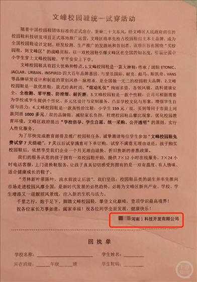 ·無工商登記的科技公司在河南安陽推廣校園鞋,159元一雙,教育局:“是有校園鞋試穿活動(dòng),對公司情況不清楚。”涉事公司:公司名字寫錯(cuò)了。