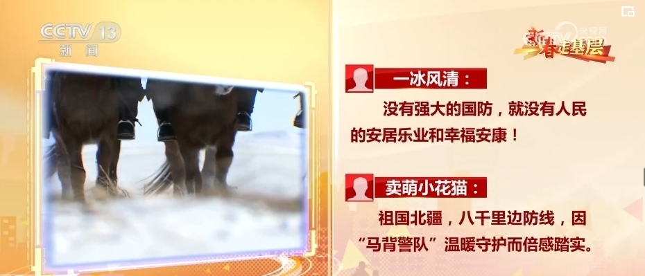 《新春走基層·馬背警隊(duì):風(fēng)雪中的溫暖守護(hù)》播出后,有網(wǎng)友說:“沒有強(qiáng)大的國防,就沒有人民的安居樂業(yè)和幸福安康!”。也有網(wǎng)友說:“祖國北疆,八千里邊防線,因“馬背警隊(duì)”溫暖守護(hù)而倍感踏實(shí)。”