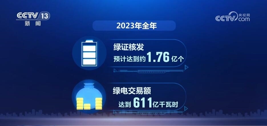全覆蓋,是2023年我國綠電消費的一大關(guān)鍵詞。通過給已建檔立卡的可再生能源發(fā)電項目全部核發(fā)綠證,我國成為全球最大的綠證供應(yīng)市場。全年綠證核發(fā)預(yù)計達(dá)到約1.76億個,綠電交易額達(dá)到611億千瓦時,分別是2022年的7.8倍和10.5倍。