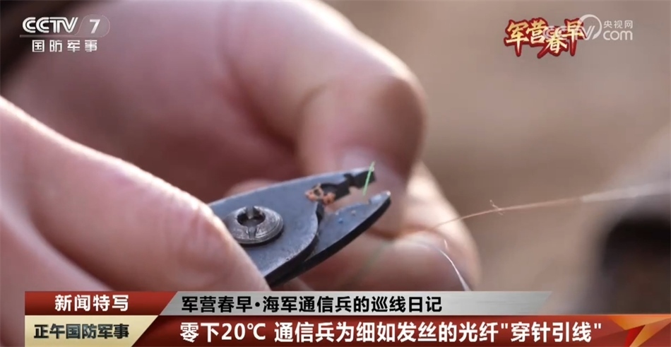 海軍某總站 鄭乾:因為光纖是玻璃材質(zhì)的,冬天特別寒冷,就會導(dǎo)致光纖特別容易斷裂,特別是在光纖切割刀切割光纖的時候,一不小心就會砸斷,有可能出現(xiàn)強(qiáng)行熔接的情況,一旦出現(xiàn)這種情況,任務(wù)就(可能)因為(數(shù)據(jù))無法使用,任務(wù)就會無法開展、失敗了。