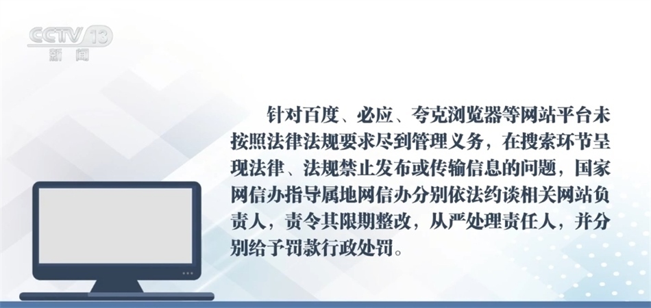 針對(duì)百度、必應(yīng)、夸克瀏覽器等網(wǎng)站平臺(tái)未按照法律法規(guī)要求盡到管理義務(wù),在搜索環(huán)節(jié)呈現(xiàn)法律、法規(guī)禁止發(fā)布或傳輸?shù)男畔栴},國家網(wǎng)信辦指導(dǎo)屬地網(wǎng)信辦分別依法約談相關(guān)網(wǎng)站負(fù)責(zé)人,責(zé)令其限期整改,從嚴(yán)處理責(zé)任人,并分別給予罰款行政處罰。