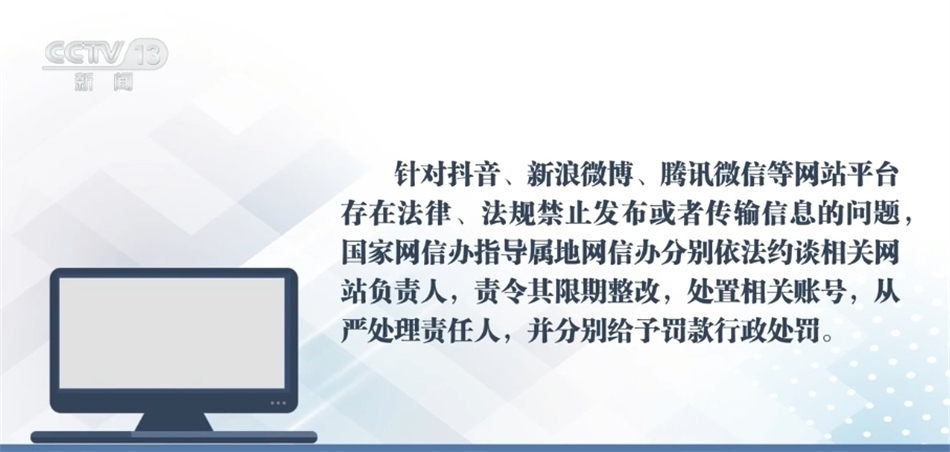 針對(duì)抖音、新浪微博、騰訊微信等網(wǎng)站平臺(tái)存在法律、法規(guī)禁止發(fā)布或者傳輸信息的問題,國家網(wǎng)信辦指導(dǎo)屬地網(wǎng)信辦分別依法約談相關(guān)網(wǎng)站負(fù)責(zé)人,責(zé)令其限期整改,處置相關(guān)賬號(hào),從嚴(yán)處理責(zé)任人,并分別給予罰款行政處罰。