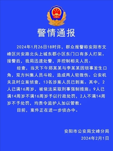 ·河南安陽警方通報(bào)一起斗毆案:2人因瑣事爭執(zhí)糾集多人斗毆,13人已到案,其中11人不滿16歲。