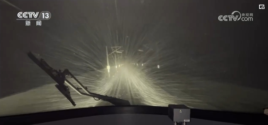 從零時(shí)15分開始到清晨4點(diǎn)多,熱滑除冰車分別駛過(guò)鄭州東、黃河大橋、新鄉(xiāng)和南樂,車窗外白雪皚皚,視線和視野都受到限制。一路上,雨滴和雪粒不斷敲打著車窗,從接觸網(wǎng)上掉落的冰碴,不斷落在車頂上砰砰作響,銅基受電弓在結(jié)冰的接觸網(wǎng)上拉出長(zhǎng)長(zhǎng)的電弧,噼里啪啦電光四射。