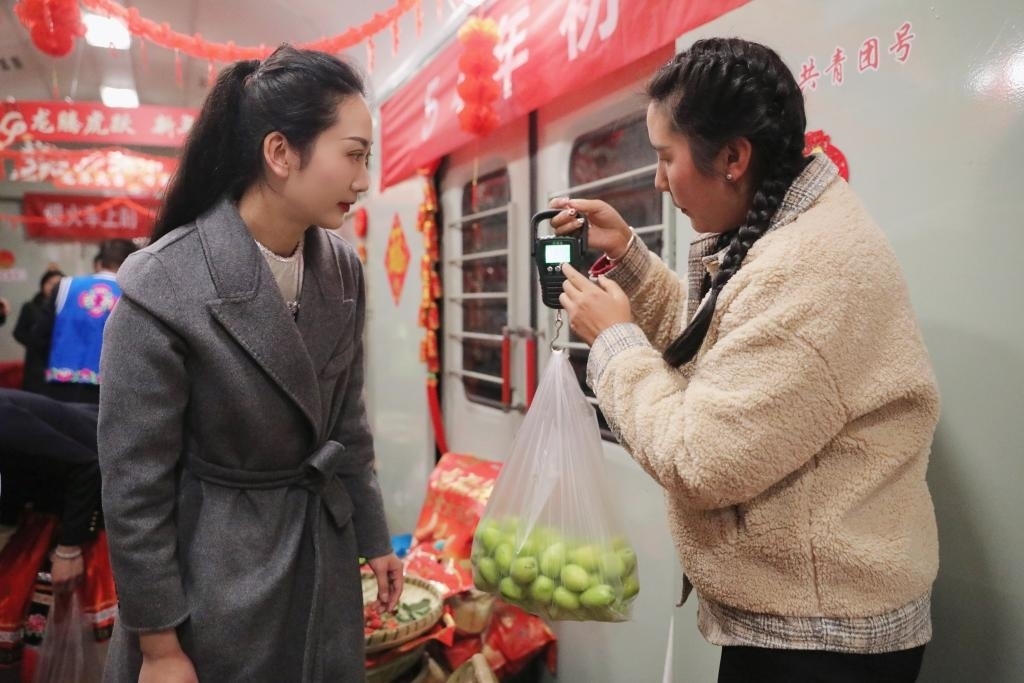 春節(jié)臨近,家家戶戶忙著采買年貨。中國鐵路昆明局集團(tuán)有限公司在云南昆明至元謀西的公益性“慢火車”7466/5次列車上辦起了年貨街。