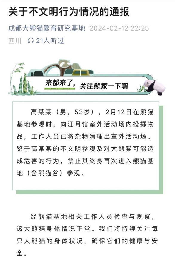 ·一游客在成都大熊貓基地參觀時(shí)向場內(nèi)投擲物品,被終身禁入。