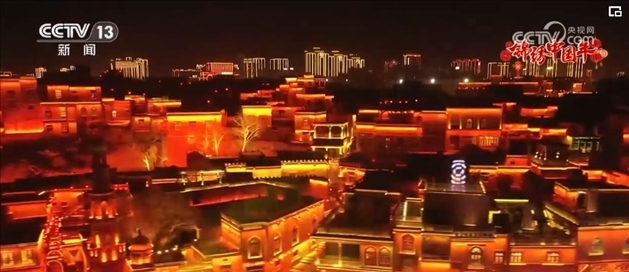 當(dāng)夜幕降,臨燈光亮起,總臺(tái)春晚新疆喀什分會(huì)場(chǎng)主舞臺(tái)在與喀什古城民居交相輝映,喀什古城變了浪漫舞臺(tái)。土陶店、手打銅器店等特色店鋪門(mén)前站滿了游客。烤肉、抓飯、鴿子湯等特色美食更是吸引著大家駐足品嘗。