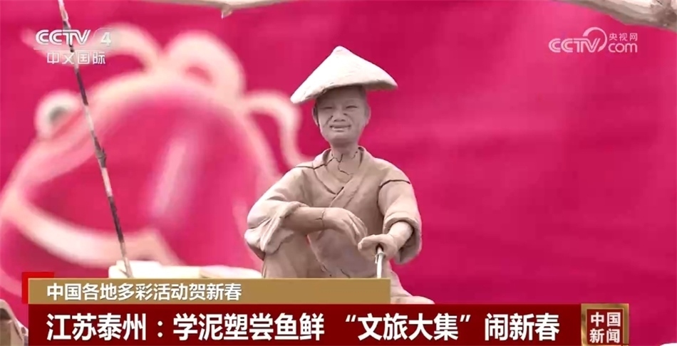 春節(jié)期間,江蘇泰州興化市舉辦了新春“文旅大集”活動。在現(xiàn)場,除傳統(tǒng)花船、舞龍等民俗表演外,當?shù)啬嗨芊沁z傳承人還帶來了蟠龍、漁船、漁具等雕塑作品,游客在老師們的指導下也學起了雕刻泥塑。此外,大集上還能品嘗到新鮮水產(chǎn)品加工成的魚圓、魚頭湯,讓大家“年年有余”,圖個好彩頭。