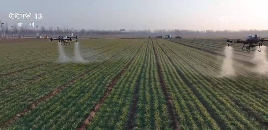 在河南安陽市滑縣,農(nóng)戶們也在忙著春季田間管理。在滑縣留固鎮(zhèn)李周村,植保無人機正在向連片小麥噴施葉面肥,促進小麥返青。