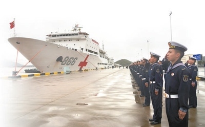 執(zhí)行“和諧使命—2022”任務(wù)的中國海軍“和平方舟”號醫(yī)院船返回浙江舟山某軍港,任務(wù)部隊官兵代表在碼頭迎接。“和平方舟”號醫(yī)院船是我國自主設(shè)計建造的首艘制式遠(yuǎn)洋醫(yī)院船。自2008年入列以來,該船以“和諧使命”任務(wù)為主要載體,多次遠(yuǎn)赴海外開展人道主義醫(yī)療服務(wù)。孫 飛攝(新華社發(fā))