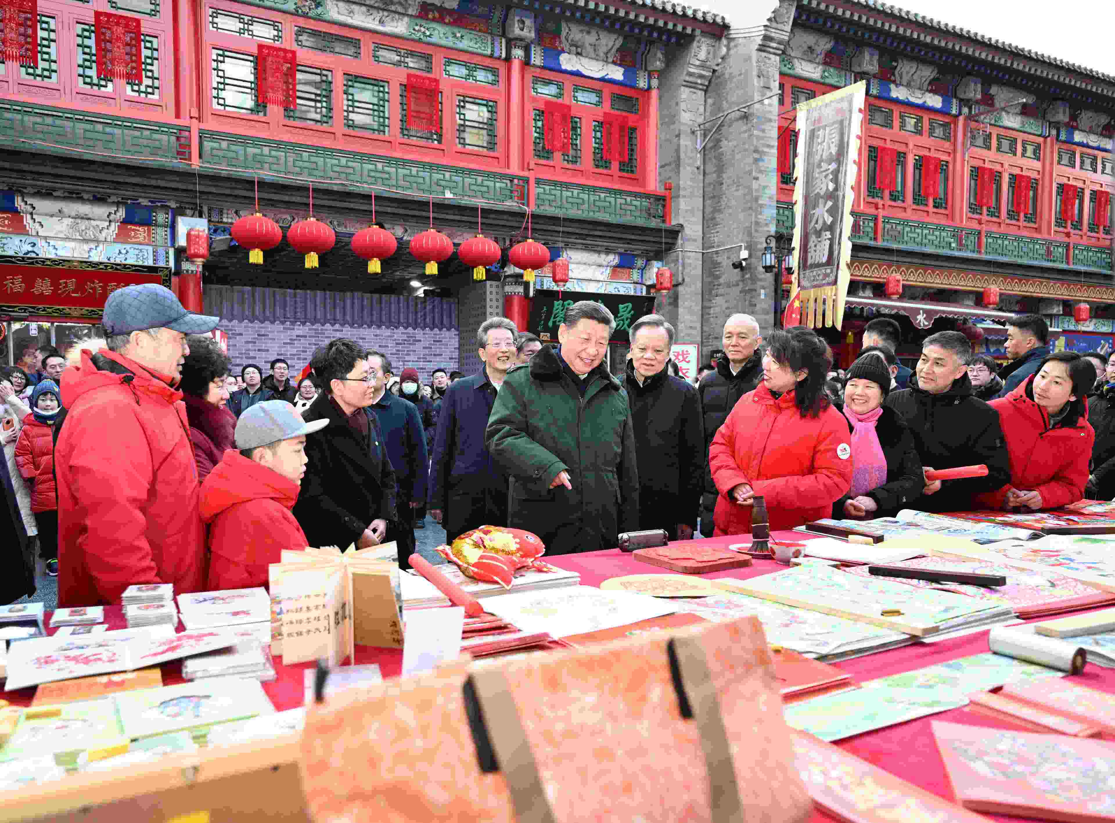 2月1日下午,總書(shū)記出現(xiàn)在了素有“津門(mén)故里”之稱(chēng)的天津古文化街。在這個(gè)天津最早的經(jīng)濟(jì)、文化、商貿(mào)聚集地,總書(shū)記考察了歷史悠久的桂發(fā)祥十八街麻花、果仁張、泥人張、楊柳青年畫(huà)等“老字號(hào)”店鋪,向小朋友贈(zèng)送麻花和栗子羹等天津特色傳統(tǒng)小吃,與群眾一起欣賞喜氣騰騰的“津味中國(guó)年”表演,看政通人和,品文脈傳承,溫故而知新。