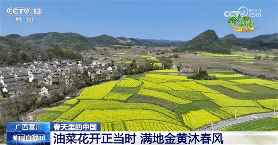 現(xiàn)在我們看到的是廣西富川瑤族自治縣的四萬(wàn)多畝油菜。眼下,春意正濃,油菜進(jìn)入盛花期,明艷的金黃色成了春日主色調(diào)。油菜花次第開放,清風(fēng)微拂,淡淡花香沁人心脾,花海與山巒、古村勾勒出一幅田園春景圖,吸引不少游客前來(lái)賞花踏青,感受春天的氣息。