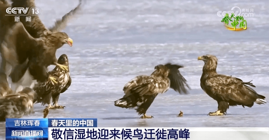 在琿春敬信濕地的龍山湖面上,數(shù)十只白尾海雕、虎頭海雕等珍稀候鳥嬉戲打鬧、爭(zhēng)搶食物,熱鬧不已。湖邊的攝影師們不時(shí)按動(dòng)快門,捕捉鳥類舞動(dòng)的精彩瞬間。