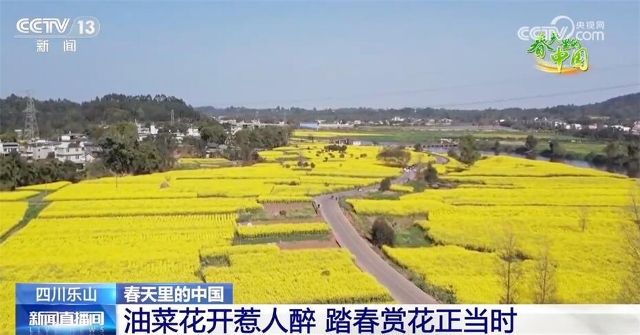 遠(yuǎn)眺峨眉山,近看峨眉河,萬(wàn)頃金波花如海,流金溢彩百里香。現(xiàn)在我們看到的是四川樂山市中區(qū) 永和村的近千畝油菜花,在陽(yáng)光照射下,猶如斑斕的綢帶,妝點(diǎn)了峨眉河沿岸五彩的山色春光。趁著晴好天氣,市民、游客來(lái)到戶外踏青賞景,在花田中徜徉流連,感受春日美好時(shí)光。