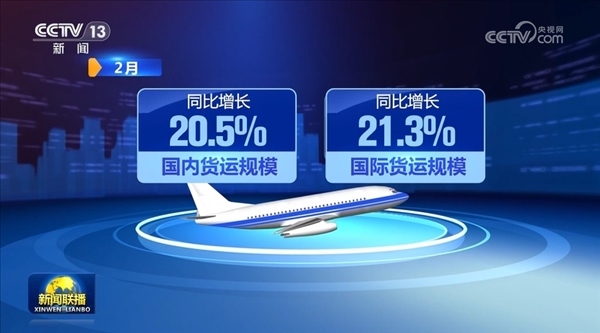 貨運(yùn)方面,2月,全行業(yè)完成貨郵運(yùn)輸量54.6萬噸,同比增長(zhǎng)20.8%。其中,國(guó)內(nèi)、國(guó)際貨運(yùn)規(guī)模同比分別增長(zhǎng)20.5%、21.3%。1—2月貨郵運(yùn)輸量達(dá)到歷年開年前兩月最高值。