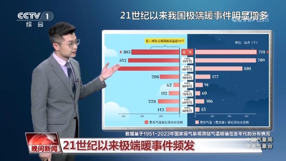 氣象分析師 胡嘯:我們統(tǒng)計(jì)了上世紀(jì)50年代以來氣溫創(chuàng)紀(jì)錄的站點(diǎn),從白天的國家級(jí)氣象站創(chuàng)紀(jì)錄站點(diǎn)來看,有百分之七十都出現(xiàn)在21世紀(jì),近三年數(shù)量達(dá)到了503個(gè),在這其中有六成站點(diǎn)的極端最高氣溫都突破了40℃。不僅白天的氣溫高,夜間的氣溫也很高,大致有百分之八十的站點(diǎn)都出現(xiàn)在21世紀(jì)。近三年是達(dá)到了714個(gè),這要比以往任何十年的累加都要多。