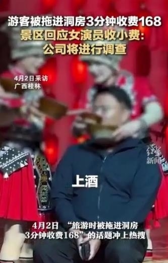 ·游客被拖進(jìn)洞房3分鐘收費168元,景區(qū)回應(yīng):系女演員收小費。廣西陽朔文旅部門介入調(diào)查。