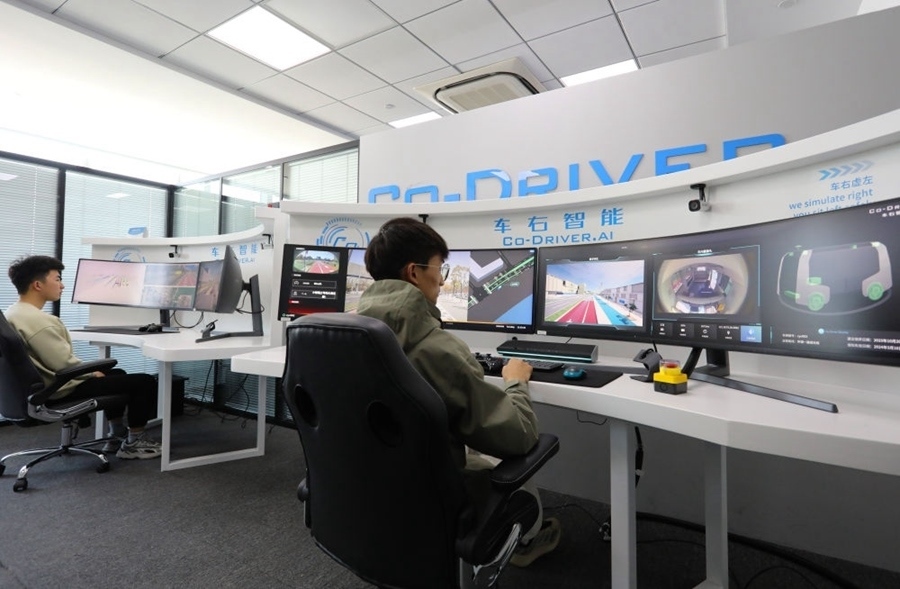 在位于中國(guó)(上海)自由貿(mào)易試驗(yàn)區(qū)臨港新片區(qū)的一家智能駕駛企業(yè),工作人員通過無人駕駛汽車遠(yuǎn)程監(jiān)管平臺(tái)的實(shí)時(shí)畫面,結(jié)合電子地圖對(duì)在自動(dòng)駕駛測(cè)試專用路上行駛的車輛進(jìn)行監(jiān)管(2024年4月9日攝)。