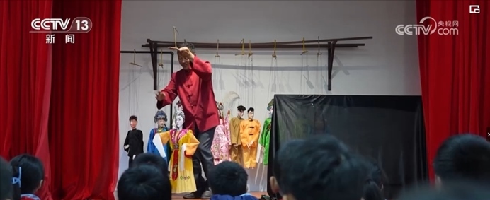 舞臺上,廿八都小學的同學們,一邊操縱木偶,一邊唱著臺詞,在非遺傳承人金宗懷的帶領下,正在演出他們最新排演的木偶戲。