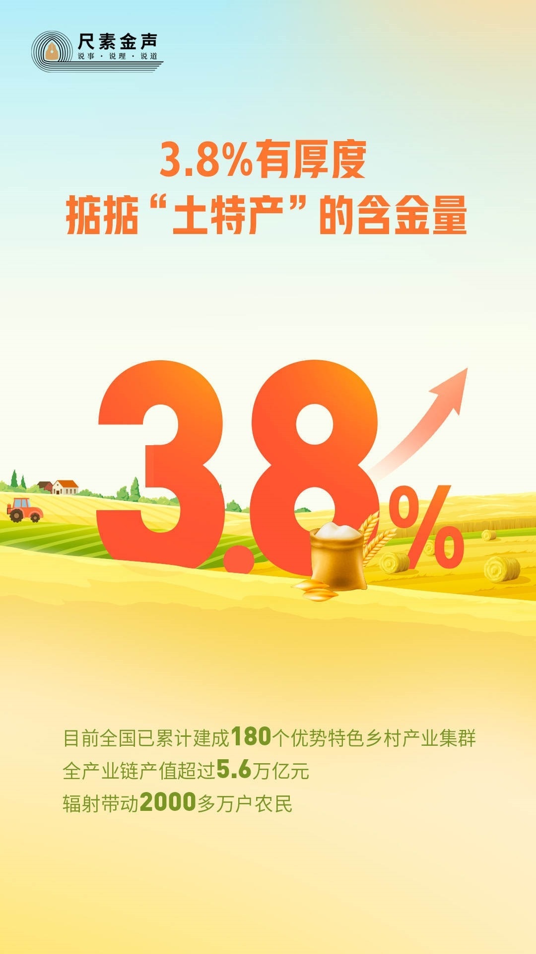 透過這3.8%,我們還可以看到現(xiàn)代化大農(nóng)業(yè)發(fā)展的廣闊前景。在廣西柳州,一碗螺螄粉“嗦”出一個(gè)大產(chǎn)業(yè),從原材料種養(yǎng)殖,到食品制作加工,再到產(chǎn)品流通銷售,螺螄粉產(chǎn)業(yè)帶動(dòng)66萬畝原材料基地,創(chuàng)造30多萬個(gè)就業(yè)崗位,去年全產(chǎn)業(yè)鏈銷售收入為669.9億元。贛南臍橙、延安蘋果、橫州茉莉花、文登西洋參……一個(gè)個(gè)土特產(chǎn),延展出一條條產(chǎn)業(yè)鏈,支撐起一個(gè)個(gè)優(yōu)勢特色產(chǎn)業(yè)集群。目前全國已累計(jì)建成180個(gè)優(yōu)勢特色鄉(xiāng)村產(chǎn)業(yè)集群,全產(chǎn)業(yè)鏈產(chǎn)值超過5.6萬億元,輻射帶動(dòng)2000多萬戶農(nóng)民。
