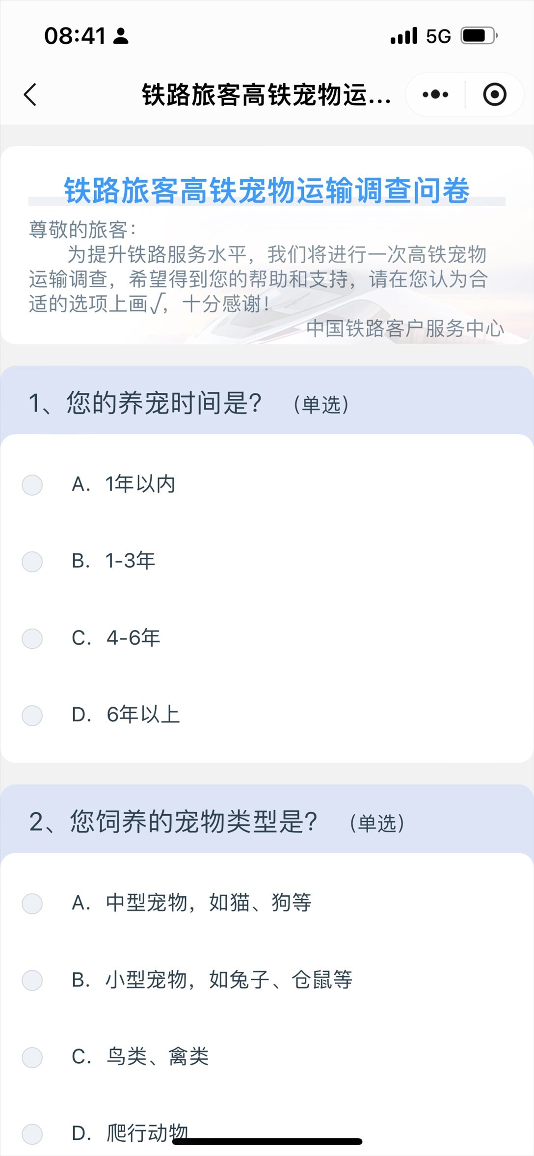近日,中國鐵路客戶服務(wù)中心推出高鐵寵物運(yùn)輸調(diào)查問卷,澎湃新聞?dòng)浾咦⒁獾?,問卷位?2306系統(tǒng)內(nèi),涉及養(yǎng)寵類型、是否愿意嘗試高鐵寵物運(yùn)輸、定價(jià)標(biāo)準(zhǔn)、非養(yǎng)寵人士有何建議等15個(gè)問題。