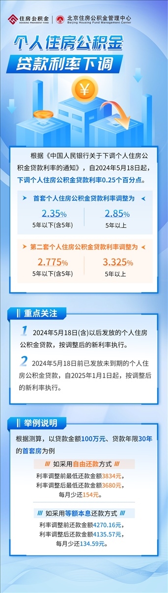 5月18日,北京住房公積金管理中心發(fā)布消息,5月18日起下調個人住房公積金貸款利率0.25個百分點。