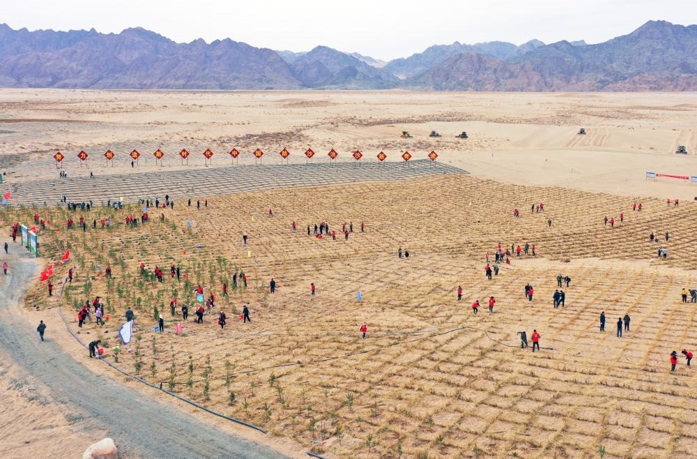 阿拉善盟位于內(nèi)蒙古最西部,盤踞在此的騰格里沙漠、巴丹吉林沙漠、烏蘭布和沙漠有連片之憂。阿拉善盟林草局局長圖布新說,一開春,阿拉善盟即全面啟動(dòng)規(guī)劃治沙總面積達(dá)621.3萬畝的內(nèi)蒙古西部荒漠綜合治理項(xiàng)目(二期),目前已有168個(gè)作業(yè)區(qū)開工,累計(jì)完成治沙面積340余萬畝。
