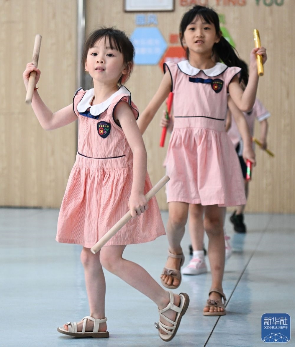 5月29日,在汕頭市貴嶼鎮(zhèn)北林保嬰幼兒園,莊恩琪(前左)在練習(xí)跳英歌舞。