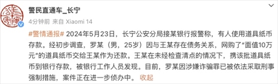 ·警方通報(bào)女子拿10萬練功券存銀行:25歲男子網(wǎng)購(gòu)道具鈔還債,已被刑拘。