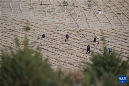 在其白線沙地綜合治理工程項(xiàng)目區(qū),記者跟隨治沙隊(duì)伍在松軟的沙丘上迎坡徒步前行,每走一步,退后半步,沙粒灌滿鞋履。然而,來(lái)自當(dāng)?shù)氐闹紊橙罕妳s早已習(xí)慣,他們兩三人一組,配合默契,有人拉著稻草橫放鋪平,有人則用工具按壓培土,還有人跟在后面,在鋪好的草方格里撒下草籽。“最高峰的時(shí)候每天有上千人參與治沙,推進(jìn)速度很快。”劉環(huán)宇介紹,今年以來(lái)全旗已完成26.5萬(wàn)畝的治沙任務(wù)。