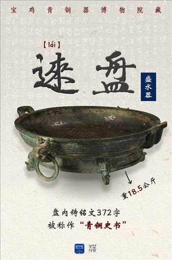 這件青銅器是被稱作“青銅史書”的逨盤。盤內(nèi)鑄銘文372字,完整記錄了單氏家族八代人輔佐西周12位周王征戰(zhàn)、理政、管治林澤的重要史事。從銘文中可看出,周人將家族命運和國家命運緊密結(jié)合,也是后來儒家“修身、齊家、治國、平天下”的思想基礎(chǔ)。