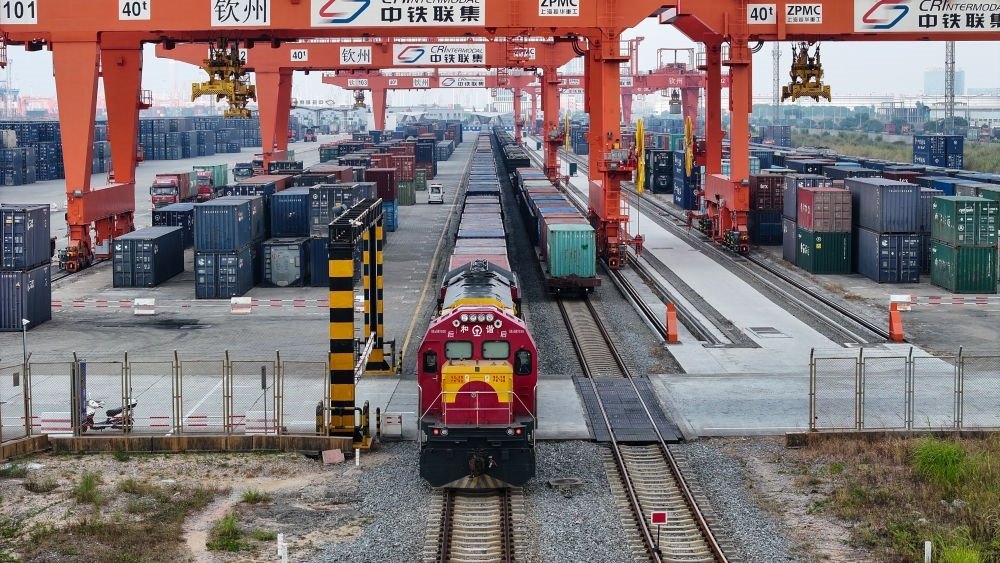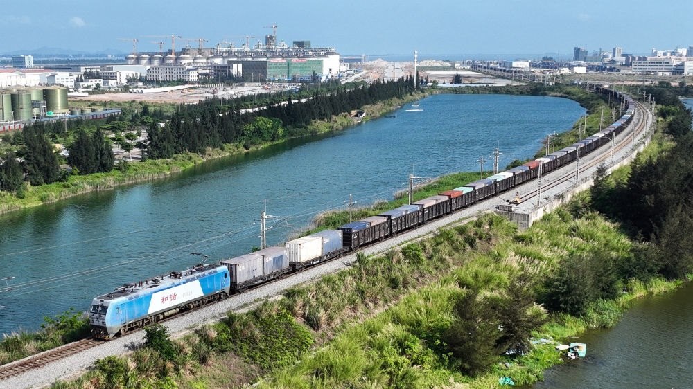西部陸海新通道鐵海聯(lián)運(yùn)班列從欽州港東站駛出(2024年5月12日攝,無(wú)人機(jī)照片)。隨著中國(guó)-東盟開(kāi)放平臺(tái)建設(shè)向縱深推進(jìn),西部陸海新通道正在成為釋放開(kāi)放活力的強(qiáng)力新引擎,以物流為切入口,促進(jìn)資金、資源、人員、技術(shù)等生產(chǎn)要素深度融合。
