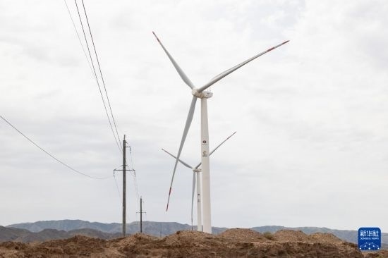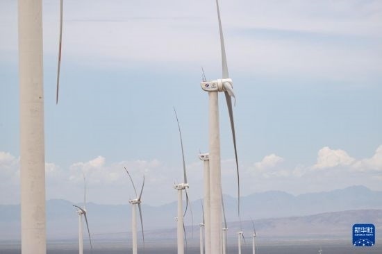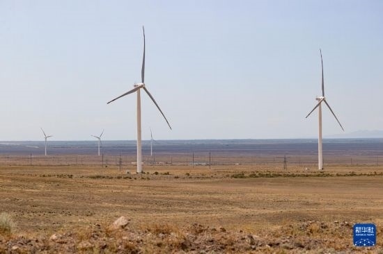這是6月25日在哈薩克斯坦阿拉木圖州謝列克風(fēng)電場拍攝的風(fēng)機。白雪騏 攝