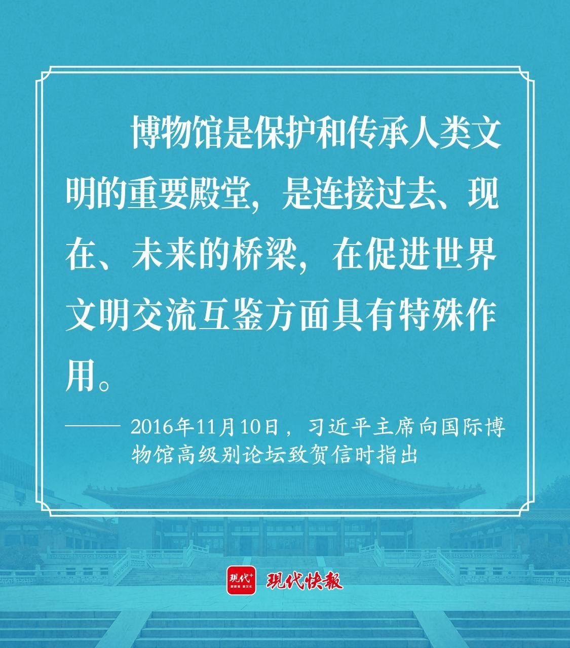 2016年11月10日,習(xí)近平主席向國(guó)際博物館高級(jí)別論壇致賀信時(shí)指出,博物館是保護(hù)和傳承人類文明的重要殿堂,是連接過(guò)去、現(xiàn)在、未來(lái)的橋梁,在促進(jìn)世界文明交流互鑒方面具有特殊作用。