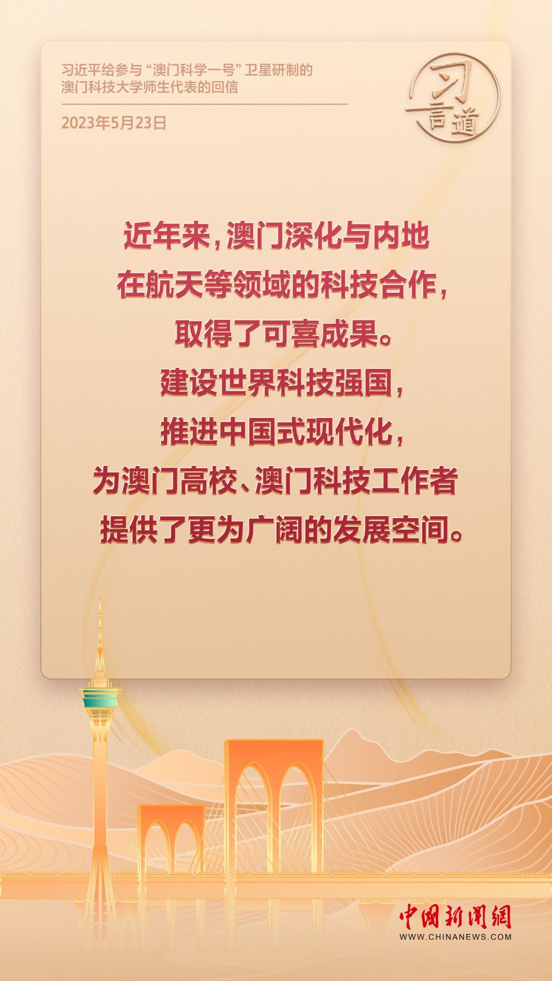 2024年是澳門(mén)回歸祖國(guó)25周年。多年來(lái),習(xí)近平主席始終關(guān)注澳門(mén)經(jīng)濟(jì)社會(huì)發(fā)展、百姓福祉,寄語(yǔ)“澳門(mén)的發(fā)展厚積薄發(fā)、未來(lái)可期”。