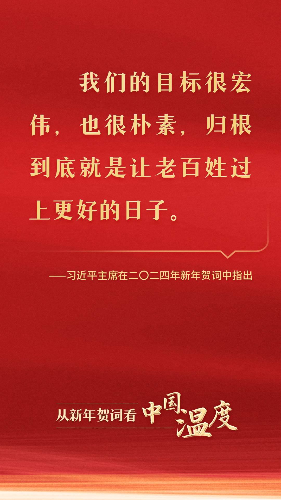 從黃土地走來,從大隊黨支部書記到黨和國家最高領導人,習近平同志深諳國情、社情、民情。在二〇二四年新年賀詞中,習近平主席話語懇切:“我們的目標很宏偉,也很樸素,歸根到底就是讓老百姓過上更好的日子?!?/p>