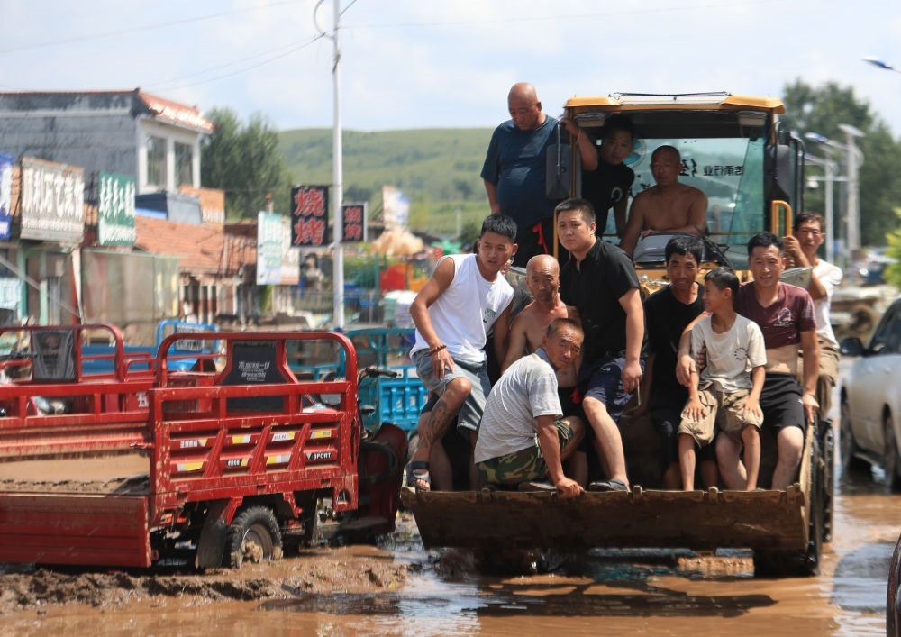 2024年8月21日,葫蘆島市建昌縣部分受災居民乘鏟車轉移。