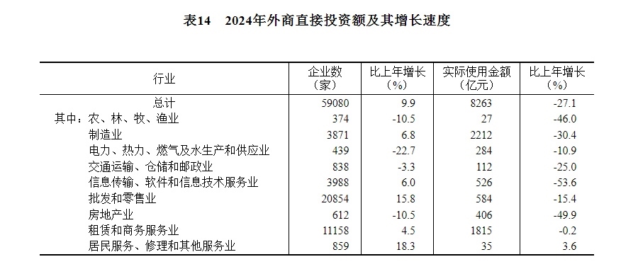 全年新設(shè)外商投資企業(yè)59080家,比上年增長9.9%。實(shí)際使用外資8263億元,下降27.1%,折1162億美元,下降28.8%。其中,共建“一帶一路”國家(含通過部分自由港對(duì)華投資)對(duì)華新設(shè)外商投資企業(yè)17172家,增長23.8%;對(duì)華直接投資1147億元,下降6.2%,折161億美元,下降8.4%。高技術(shù)產(chǎn)業(yè)實(shí)際使用外資2864億元,下降32.3%,折403億美元,下降34.0%。