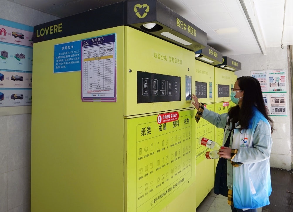 2023年5月23日,志愿者在上海市虹口區(qū)嘉興路街道愛(ài)家豪庭小區(qū)演示垃圾分類智能回收機(jī)的使用方法。