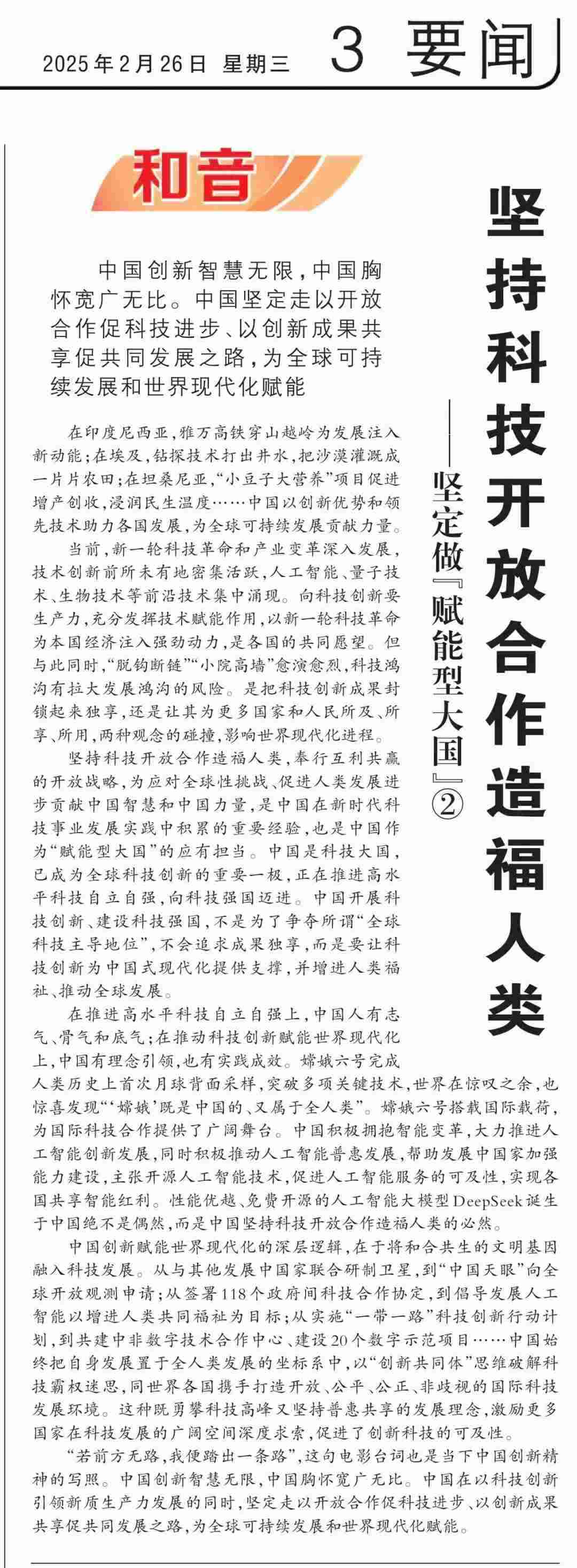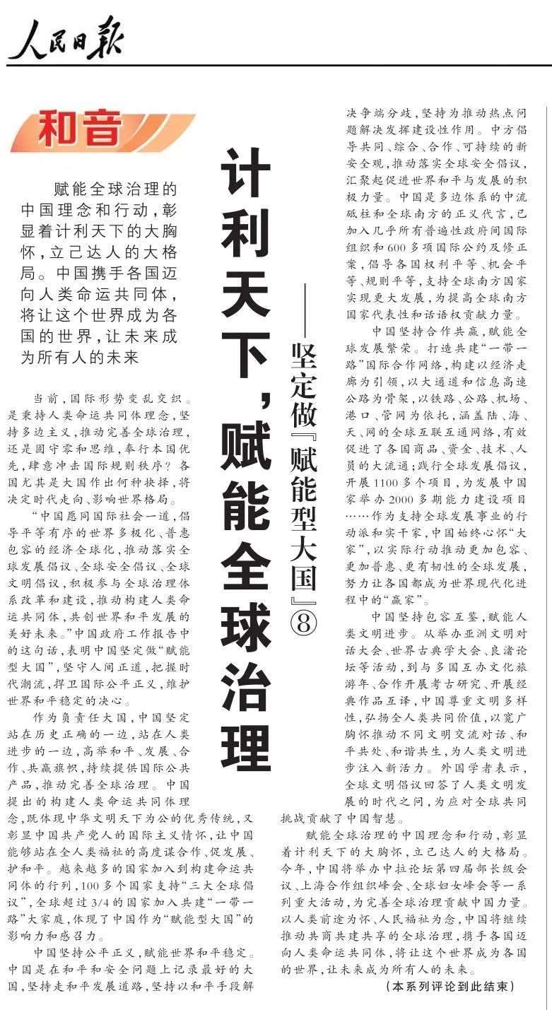 近期,《人民日?qǐng)?bào)》“和音”欄目推出“堅(jiān)定做‘賦能型大國(guó)’”系列評(píng)論,圍繞科技創(chuàng)新、開(kāi)放共贏、綠色轉(zhuǎn)型、高質(zhì)量共建“一帶一路”、多邊治理等熱點(diǎn)議題,從不同角度闡釋中國(guó)何以成為一個(gè)“賦能型大國(guó)”的深層邏輯,展現(xiàn)中國(guó)始終秉持構(gòu)建人類(lèi)命運(yùn)共同體理念,不斷以中國(guó)式現(xiàn)代化為世界現(xiàn)代化賦能的大國(guó)擔(dān)當(dāng)。