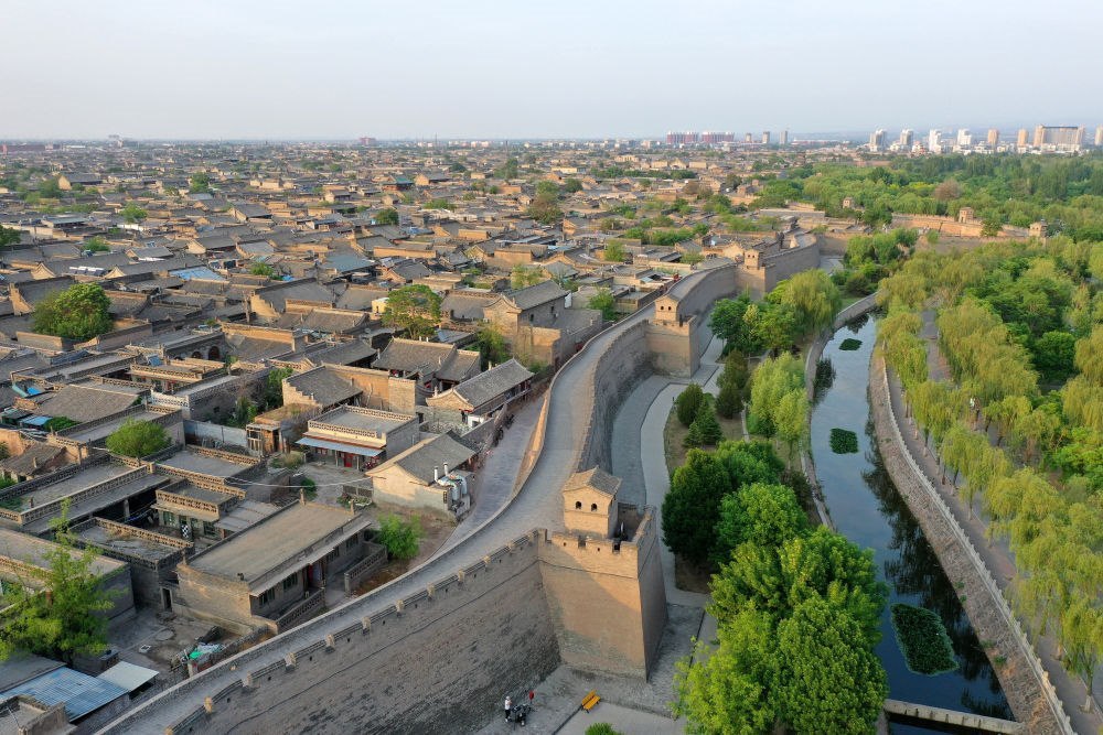 山西平遙古城城墻和護(hù)城河一角(2024年5月9日攝,無人機(jī)照片)。近年來,當(dāng)?shù)卣ㄟ^加固城墻、維護(hù)歷史建筑、逐步建立古城違建整治長效機(jī)制等措施,使這座“活著的古城”散發(fā)新的生機(jī)。